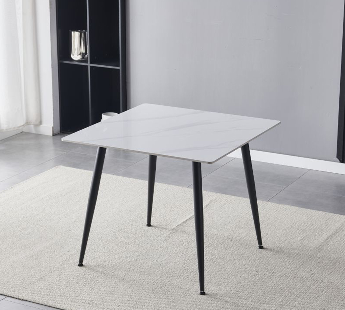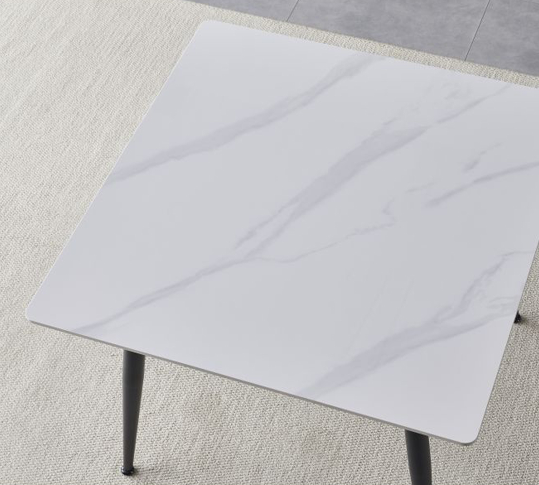 Trpezarijski sto, dostupan u sniježno bijeloj boji visokog sjaja, mat sivoj boji sa mermernim uzorkom i u imitaciji prirodne boje hrasta.
