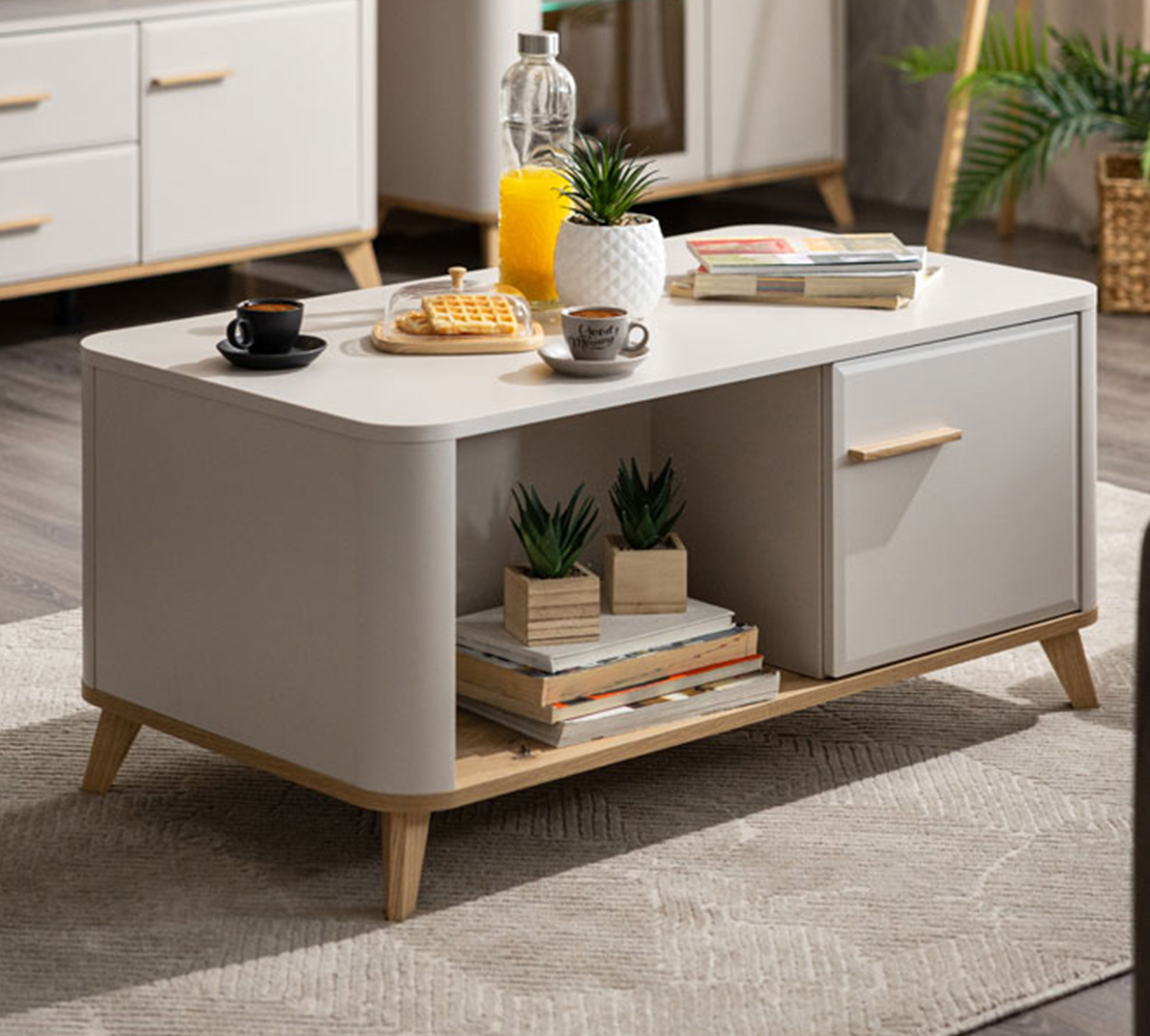 Klub sto DARWEN u kombinaciji kašmir dekora, dekora artisan hrasta i kašmir mat folije predstavlja atraktivno rješenje za sve ljubitelje modernog dizajna enterijera. Odlično raspoređen upotrebni prostor čini zatvoren segment sa policama i ispod radne površine, kao i jedan otvoreni dio za odlaganje potrebnih sitnica i dekoracije. Dio je sistema elemenata DARWEN za opremanje dnevne sobe koji zaobljenim ivicama na elementima i visokim nogarima doprinose atraktivnosti savremeno dizajniranog enterijera.