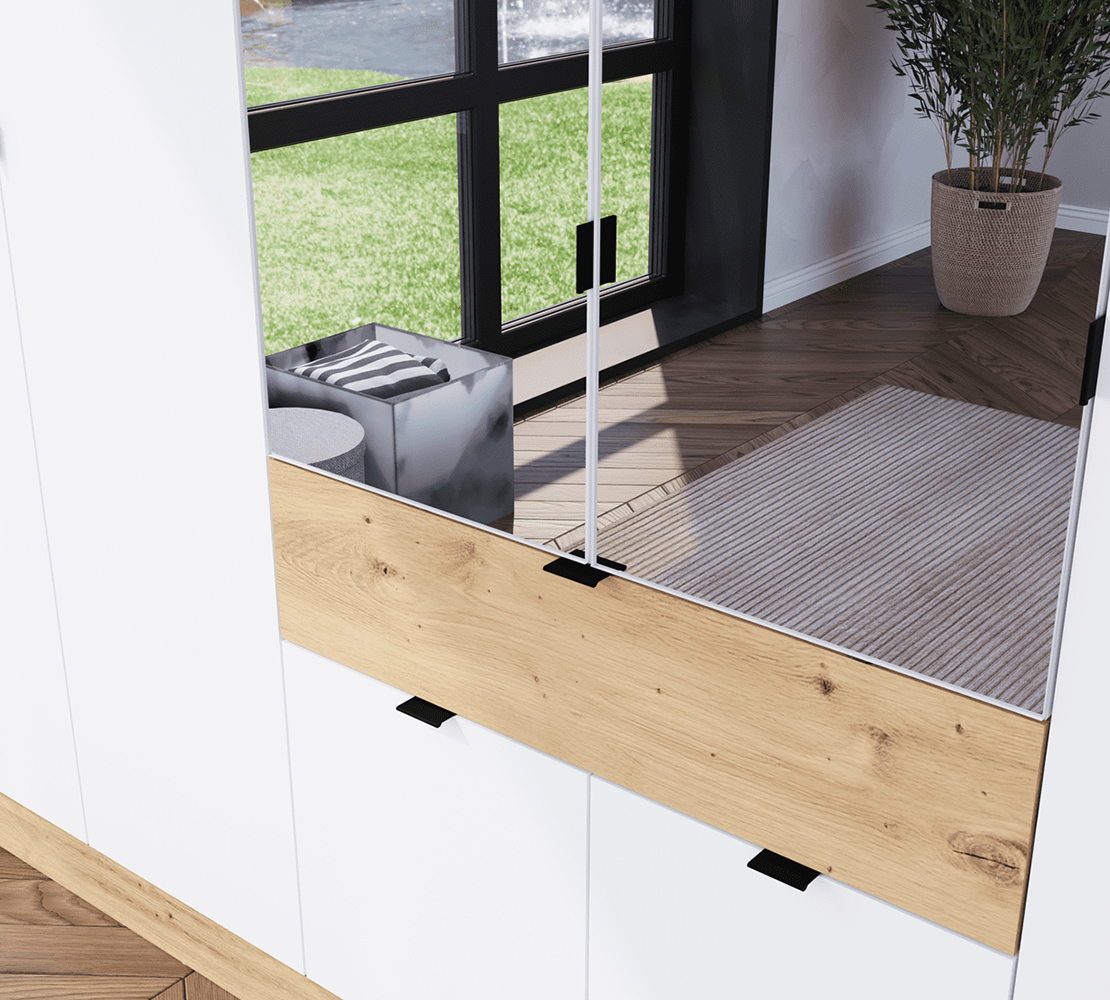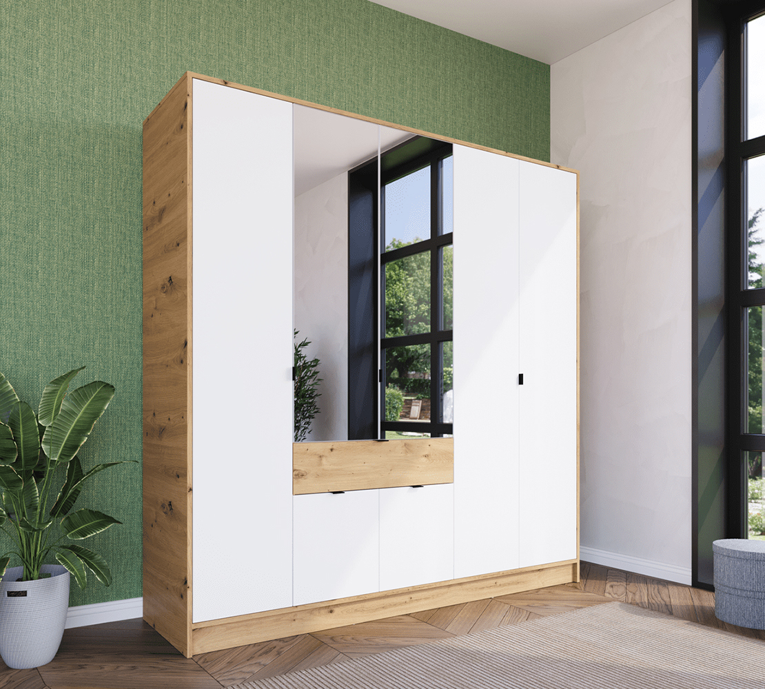 Petokrilni ormar sa korpusom i frontom od univera debljine 18mm. Izrađen je u kombinaciji drvo dekora artisan hrast/premium bijelo. Posjeduje šest unutrašnjih polica, dvije šipke i ladicu.