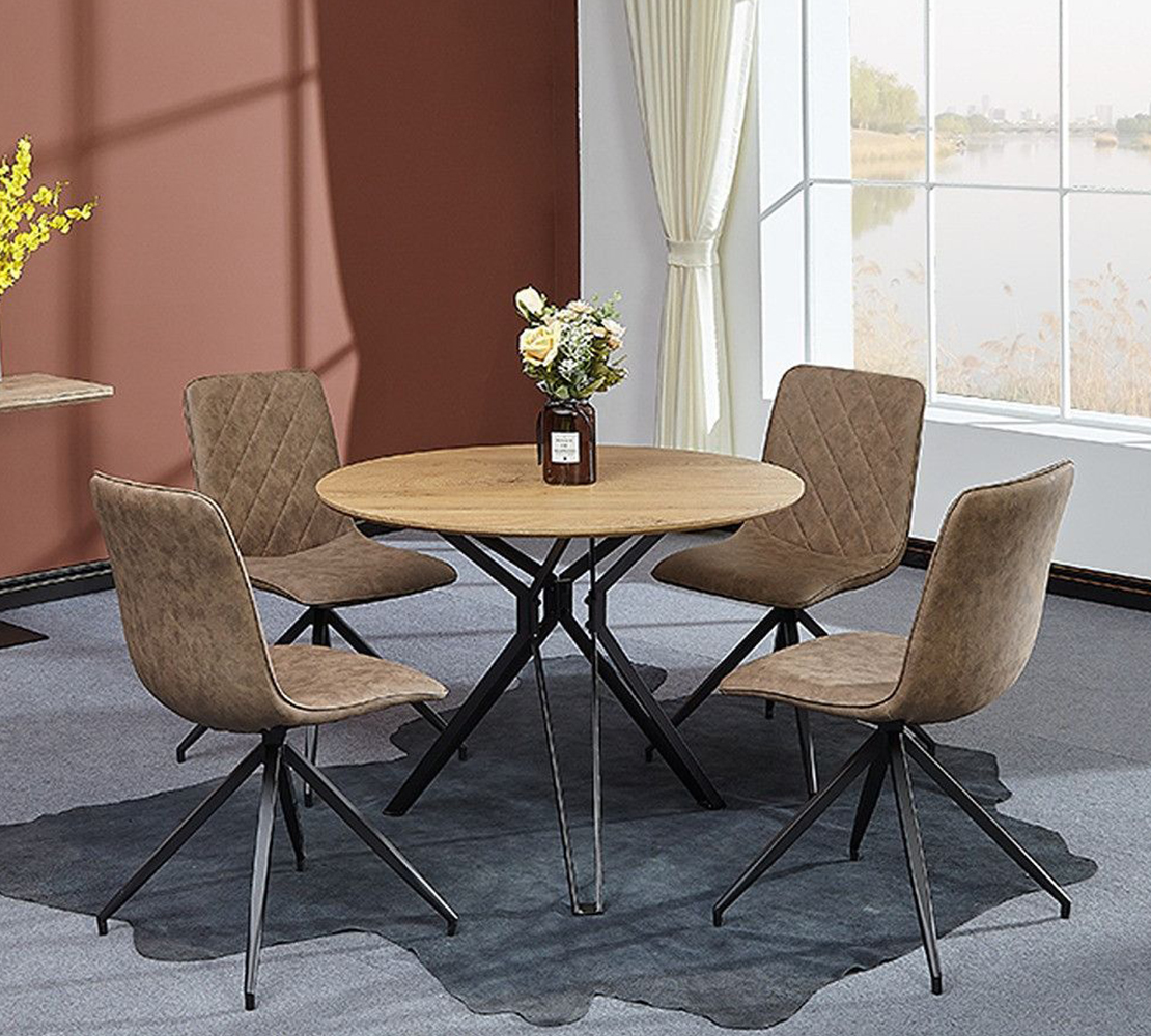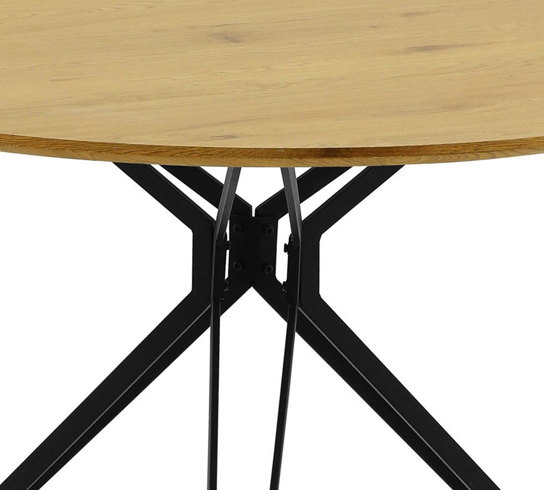 Okrugli trpezarijski sto u boji divljeg hrasta. MDF ploča, presvučena furnirom u imitaciji divljeg hrasta. Debljina ploče je 1,8 cm. Metalna baza stola je debljine 0,12 cm crne boje. Maksimalna nosivost stola je 50 kg.