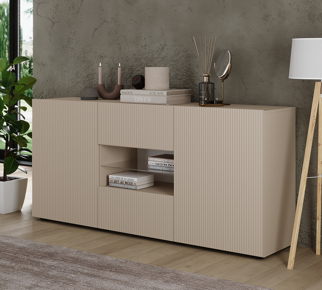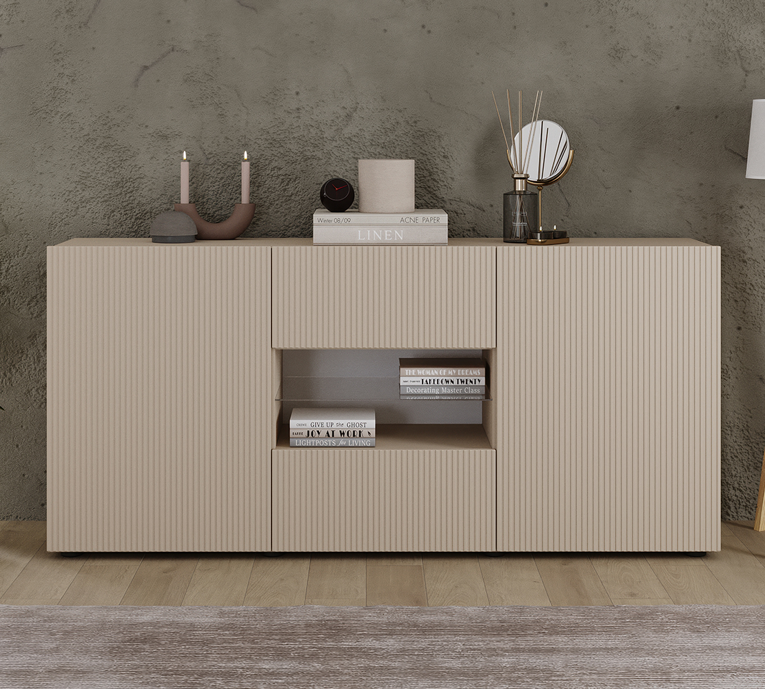 Unesite dozu profinjenosti u svoj dnevni boravak uz komodu Rio. Ovaj komad namještaja savršeno spaja minimalistički dizajn i funkcionalnost, ističući se svojim specifičnim rebrastim frontama koje prostoru daju dubinu i moderan karakter.