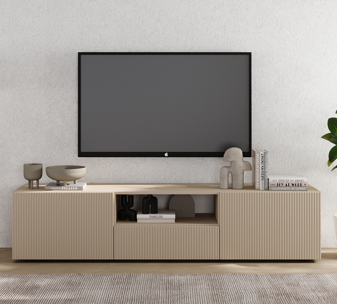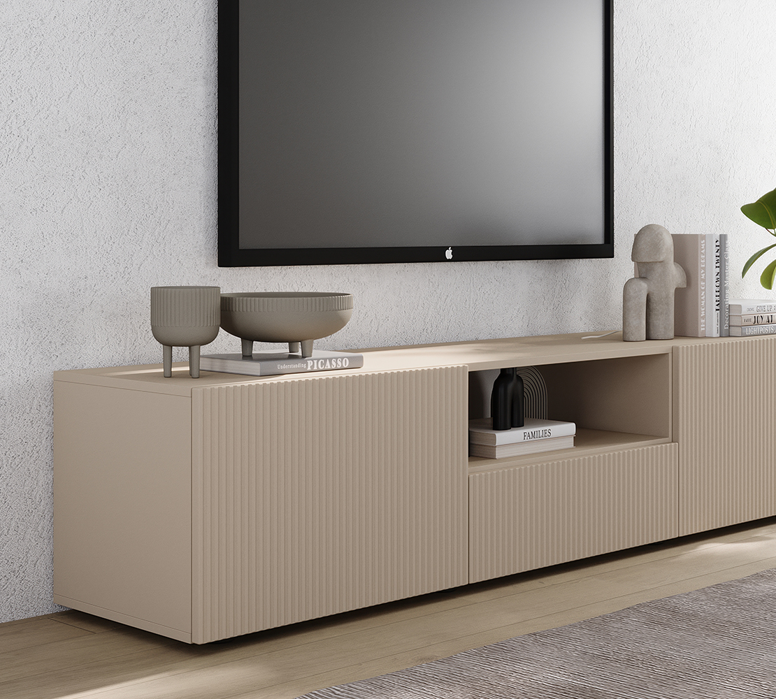 Unesite dozu profinjenosti u svoj dnevni boravak uz TV komodu Rio. Ovaj komad namještaja savršeno spaja minimalistički dizajn i funkcionalnost, ističući se svojim specifičnim rebrastim frontama koje prostoru daju dubinu i moderan karakter.
